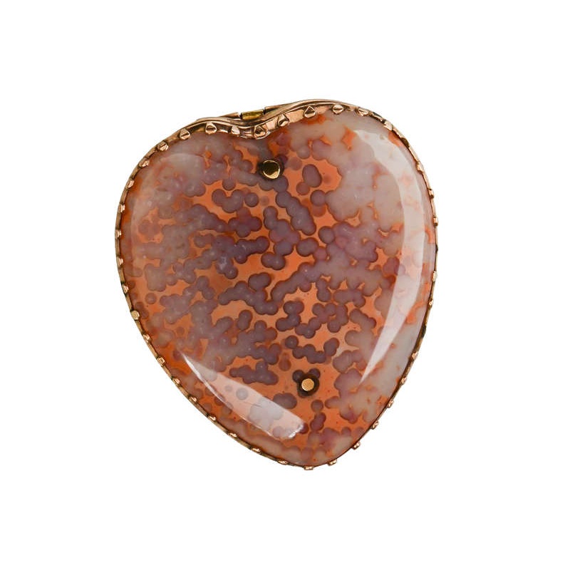 Several features give this away. The first is the “architecture” of the rose gold border. Linear incised indentations move around the collet and tiny pinches or flatted beads of gold are raised all along it, holding this marvelously, tactile agate.