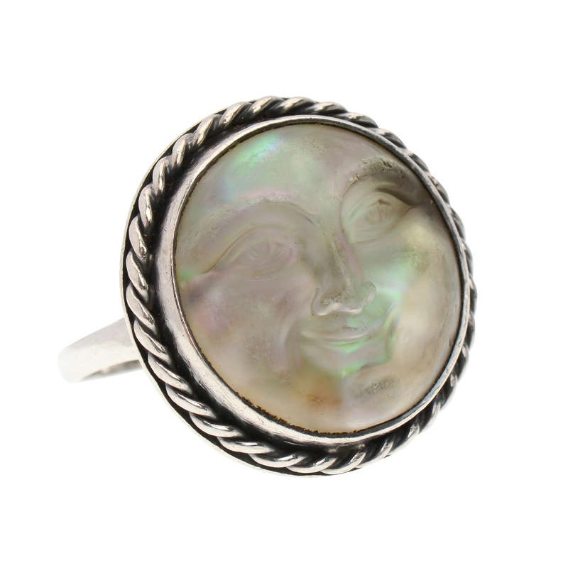 All in sterling silver for the setting, the moon face itself is bezel set with a surround of braided silver. Divided shoulder transition to a tapered, smooth shank.