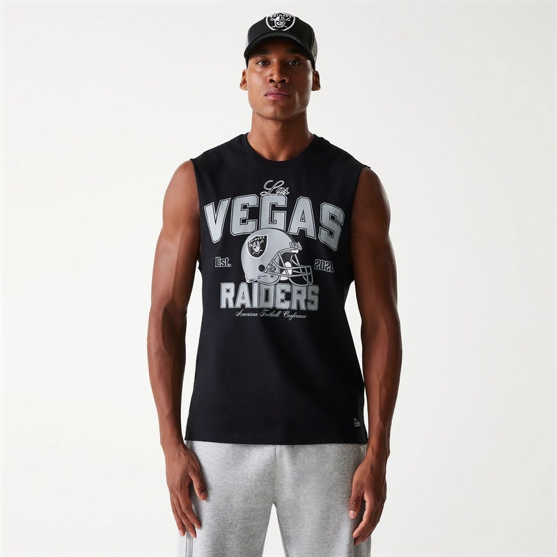 NFL Helmet Las Vegas Raiders Sleeveless T-ShirtLas Vegas Raiders Helmet graphic on frontNew Era Flag embroidered on front lower leftSleevelessModel is 6ft 2in tall and wears a size Medium100% COTTONProduct ID: 60667915