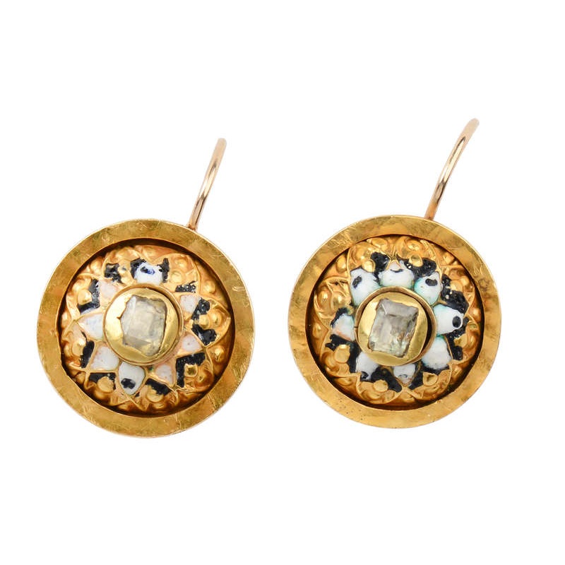 One of the earlier cuts of diamonds – the table cut – punctuates these remarkable early enamel earrings.