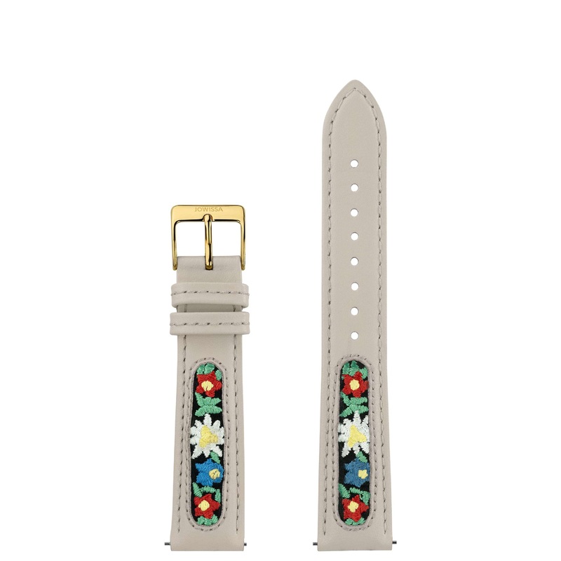 Soft 18mm beige leather watch band. Swiss flower embroidery. Genuine calf leather. Perfect fit. Adorned with Swiss mountain flowers: edelweiss, gentian, and alpine rose. A gentle Swiss style.Strap materialGenuine leather strap with embroideriesBand width18