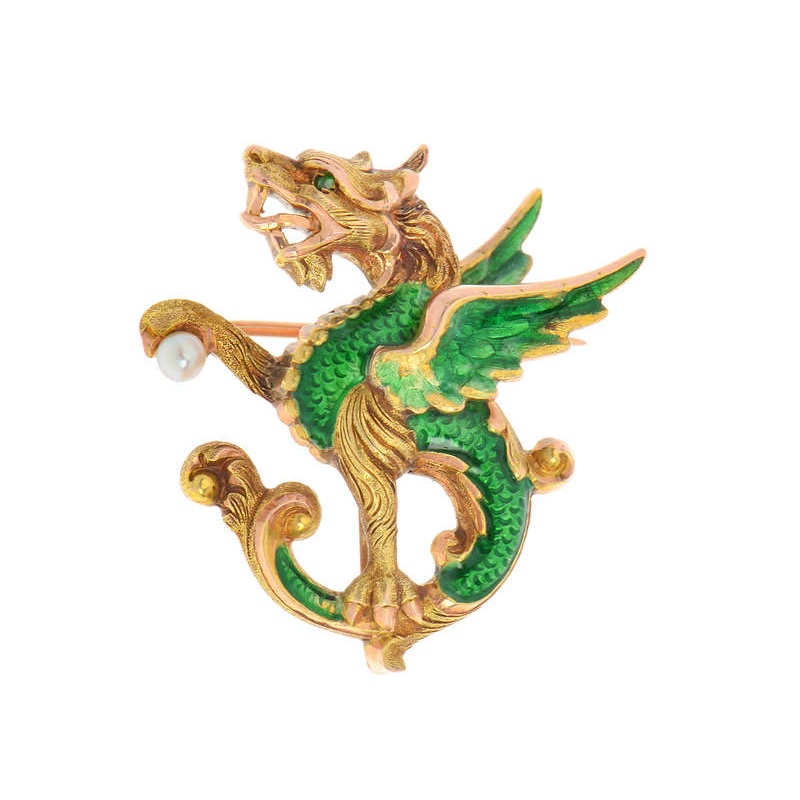 Fierce and regal, this is one mythical dragon that breathes no fire and needs no lair.From the Art Nouveau period, and very much designed in the spirit of that era, it may be a wyvern as it has two legs, while a dragon has four. Vibrant Kelly green translu