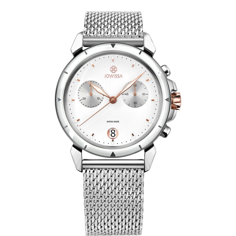 The handmade Swiss chronograph will win you over with its versatility: LeWy 6 combines a striking 42mm design in a white slate-look dial with a silver mesh strap and shows you precision timekeeping from tenths of a second to the date: aesthetics that will