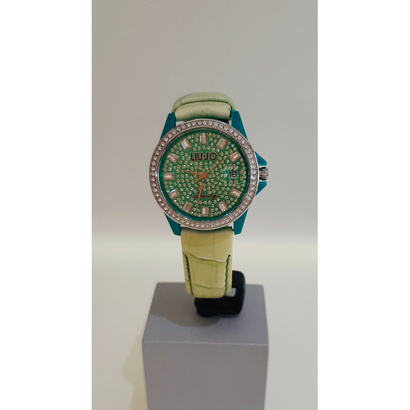 Liu-Jo watch with date, Lime Green dial enriched with green stones, logo with white stones and Light Green leather strap.