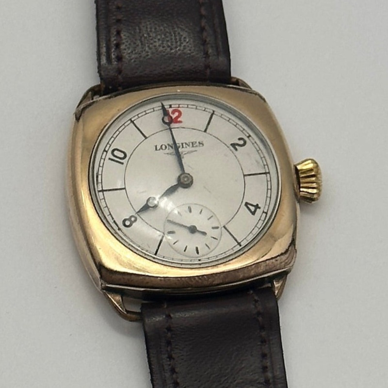 This refined vintage Longines timepiece is a stunning example of early 20th-century watchmaking. Housed in a cushion-shaped 9ct gold case, the watch features a classic ivory-toned dial with Arabic numerals, elegant blued steel hands, and a subsidiary seconds dial at the 6 oclock position. The clean design is elevated by a charming red 12 markeran iconic detail found on select vintage models. Paired with a dark brown leather strap, it maintains its original sophistication and timeless appeal. The manual wind movement inside reflects Longines’ longstanding commitment to mechanical precision.