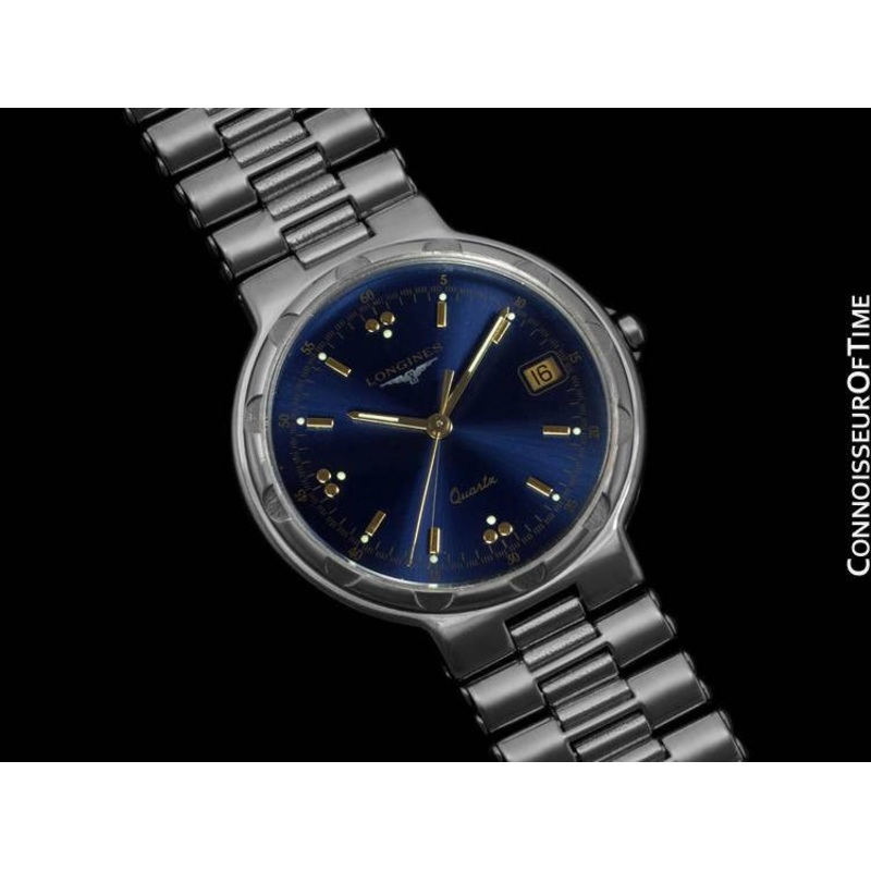 Today’s offering showcases an elegant Longines mens midsize Conquest watch. It features a regal blue dial, high-grade Longines quartzmovement with quick-setting date, sapphire crystal, and original Longines bracelet.