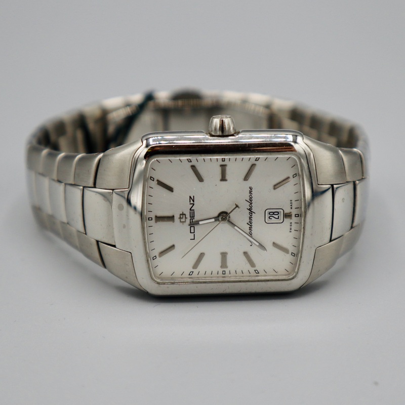 Lorenz watch with rectangular white dial, white enameled hands and double-link steel strap.