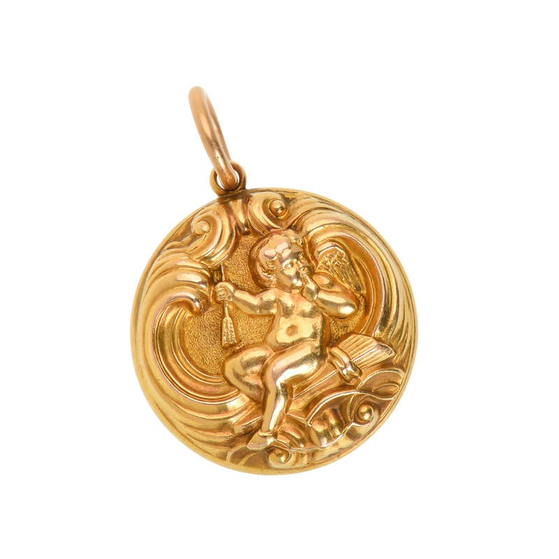 Puffy and tactile, this winged cupid or Eros motif gold locket is calling out your name.Cupid sits atop windswept clouds, poised with an arrow lifted in one hand, and a finger at his mouth, with a quizzical expression on his face. Yes, he is deciding where