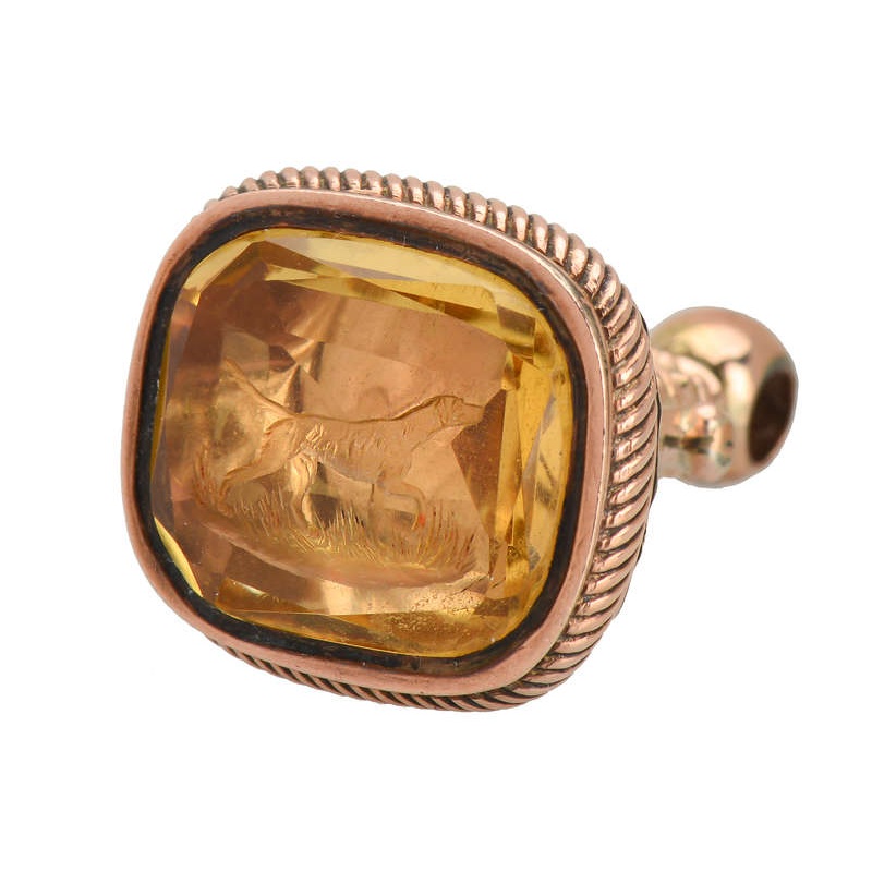 Generous in size and amber in hue, a natural citrine is faceted at the edges and at its center, an intaglio has been carved into the gemstone. The image is of a dog standing in the rushes or grass. Likely a setter, pointer, or hound, he is facing right with his leg in point position. His fur is carved in detail imparting a life-like realism.