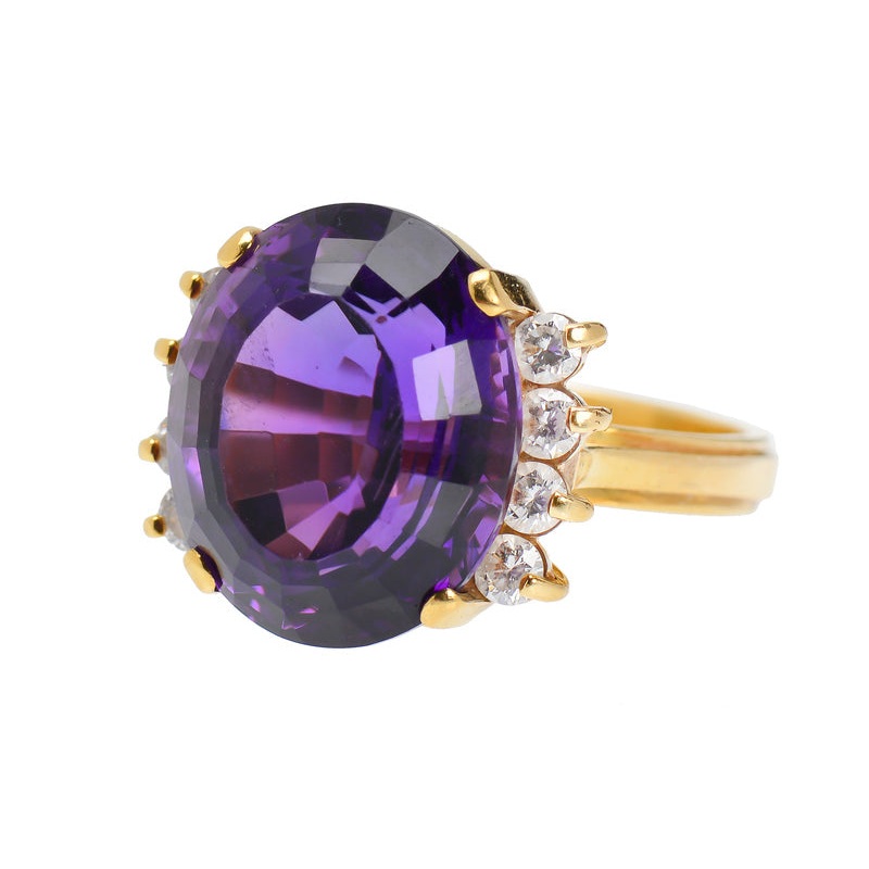 Big, bold and beautiful, an oval faceted amethyst of 12.4 carats displays deep and intense color. Simply set with four yellow gold prongs securing the royal purple stone, eight brilliant cut diamonds, total weight of .80 carats (H-I color; VS clarity) accent the sides with a burst of starlight.