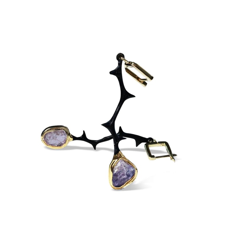 The wild energy of the earth is expressed in the form of black anthracite. This precious metal is pierced with thorn-like elements that speak of a deep natural magic. Sparkling rough spinel gemstones complete this epic poem.Details:Metal: 925 SilverStones: