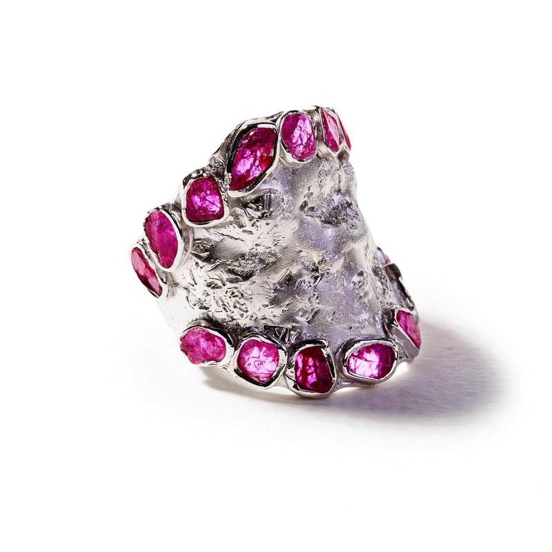 All-natural raw rubies sprinkle the organically textured silver surface, plated with precious white rhodium. Embracing the wabi-sabi philosophy of embracing perfectly imperfect aspects of life around us, this designer ring share its innate energies with th