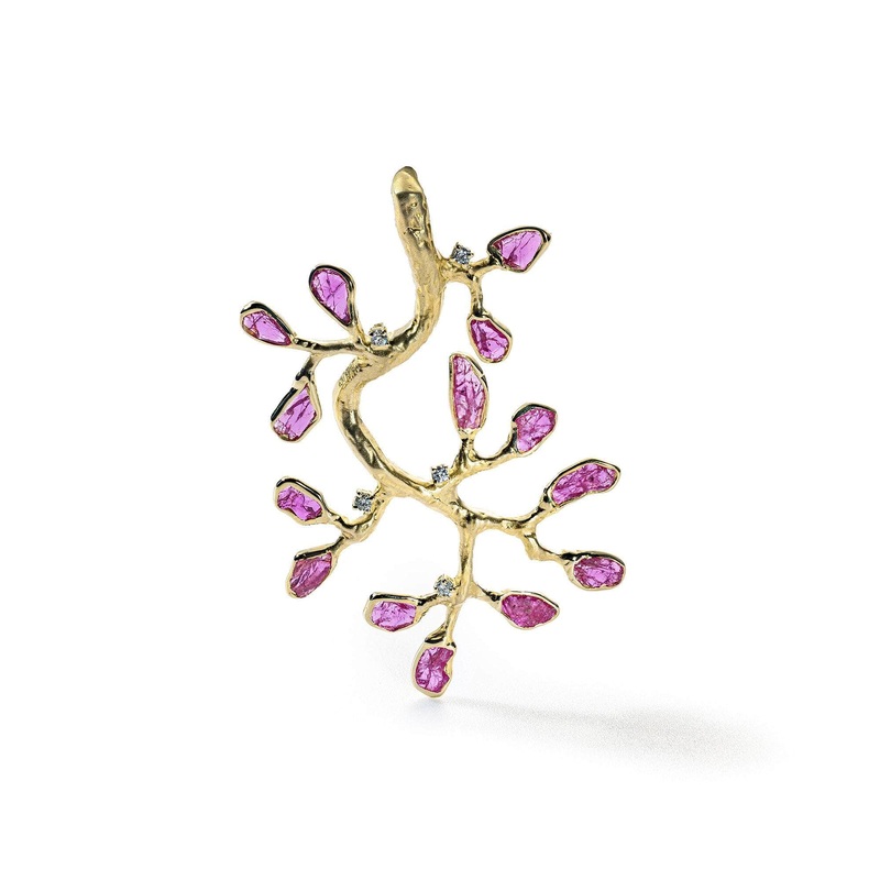 This pendant, crafted from 14K gold, takes the form of a tree branch, an homage to the natural world with rough rubies in place of leaves. Each ruby is high-grade, natural, and unenhanced, showcasing their beauty exactly as it was found in nature. The golden branch is intricately covered with brilliant-cut diamonds, providing a sophisticated contrast to the raw rubies. This piece celebrates the designers appreciation for the natural, the flawed, and the perfectly imperfect. It’s designed for those who hold a deep love for nature and value human authenticity above all else.