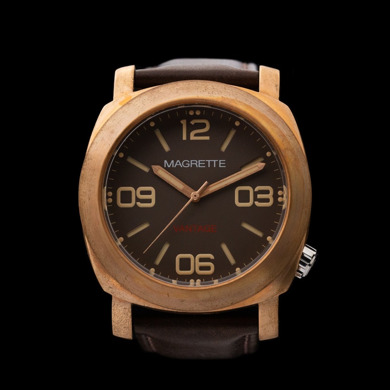 WHAT WE LOVE:The Vantage in bronze is a great-looking watch with an impressive depth rating of 500M. Brand: MagretteReference: VNTGBRNZModel: 2015 Vantage Bronze Limited EditionMovement: Miyota 9015 AutomaticCase Material: CuSn8 Bronze AlloyCase diameter: