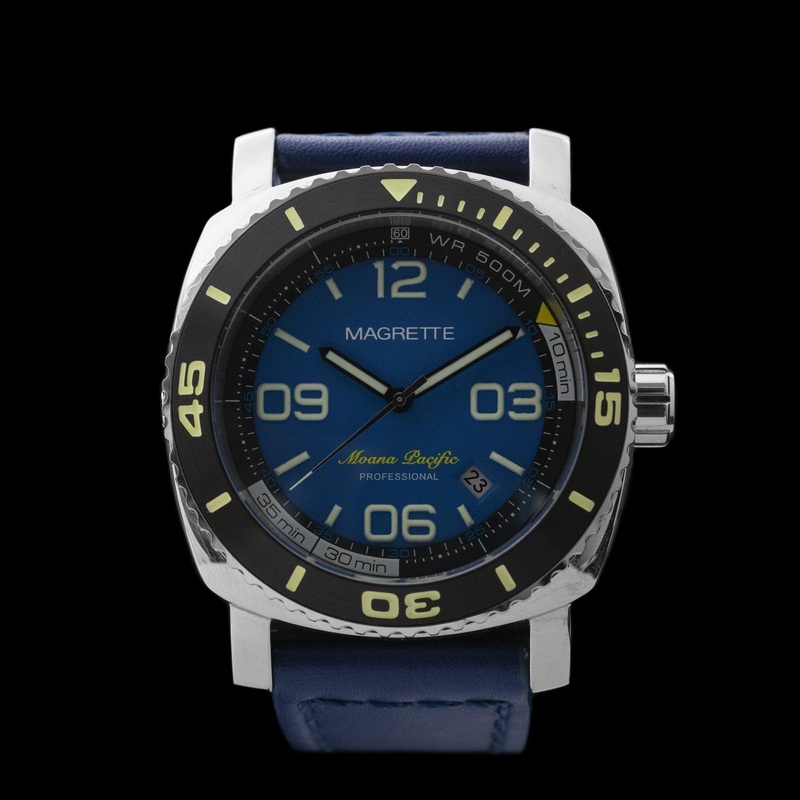 WHAT WE LOVE: Another limited edition Moana Pacific model from our friends at Magrette. This model with blue dial is quite striking. SIX MONTHS WARRANTY