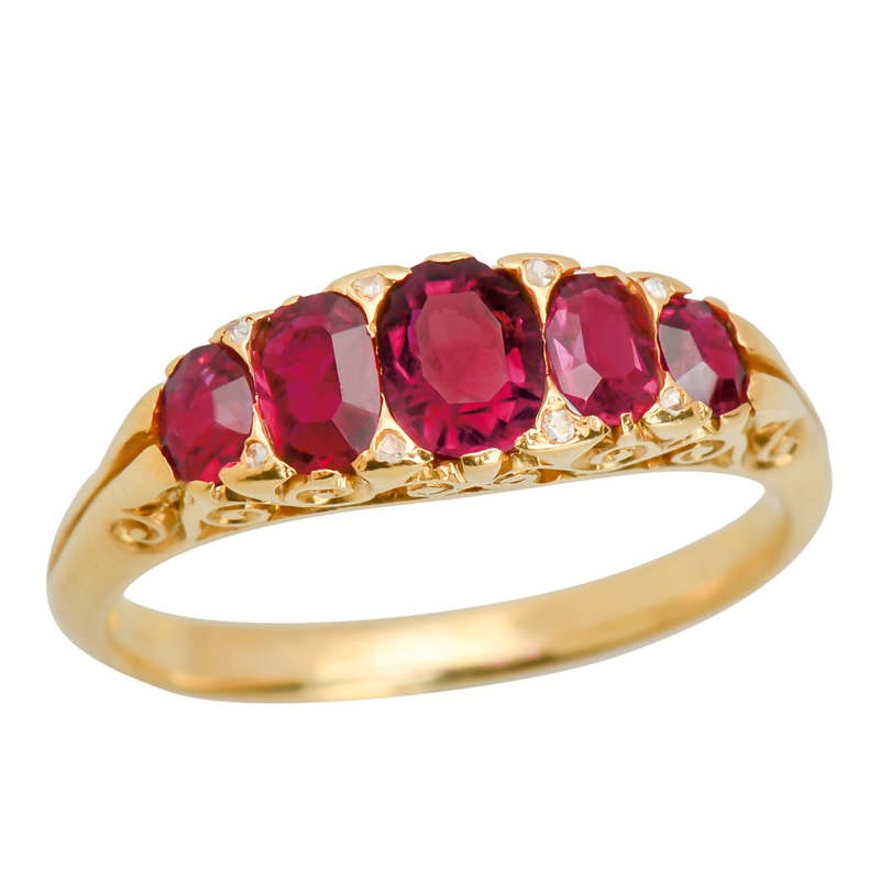 If jewelry can be mouthwatering, this ruby ring qualifies.With five red and juicy, no-heat rubies in graduated sizes...make way for this one ranks far above the norm.Oval and faceted, their hue is a saturated, rich, vibrant red. Even throughout, they glow
