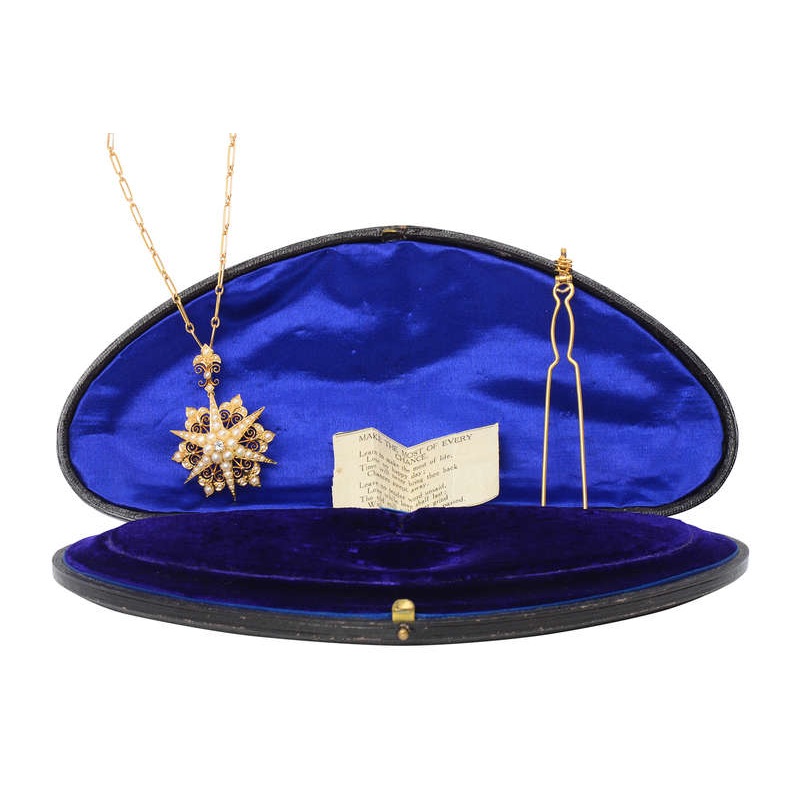Inside the main area of the box was draped the original gold chain, along with an amazing star motif pearl pendant & brooch as well as a removable matching bale.