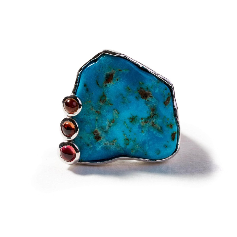 A raw turquoise ring, repeating the naturally-formed shape of the gemstone, is adorned with three contrasting pink sapphire dots on the side. This is a singular work of jewelry art, with no copies in existence, and is meant to be owned by a one-and-only individual. It’s more than a simple accessory; beyond decoration, this jewelry piece acts as a modern amulet, offering protection from the world of conformity and encouraging artistic self-expression.