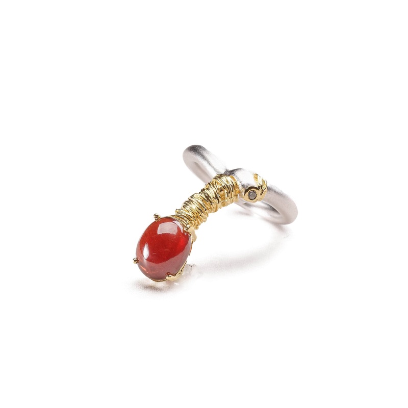 Snaking out with delicate power thisgarnet holds warm fire that creates an enchanting mood. A conflicting jewel of cubic zirconia trails behind amidst the overlapping gold threads. The heat and sparkle of this gemstone is truly unique.Details:Metal: 925 Si