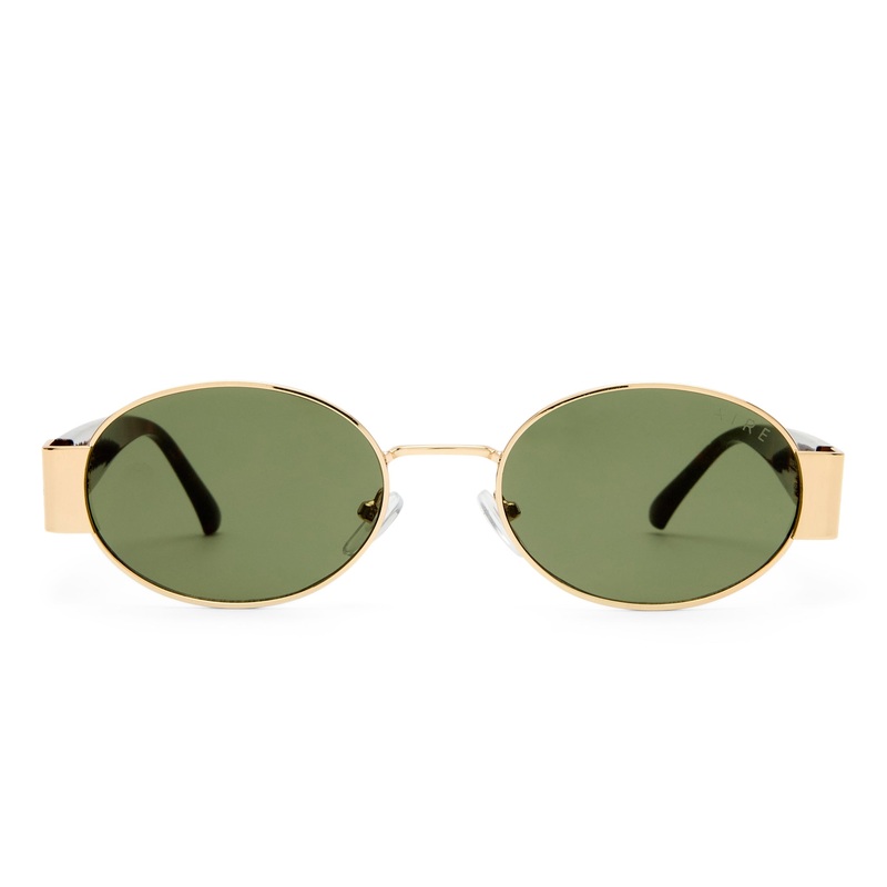Finished in a gold and dark tort frame with green mono lenses.