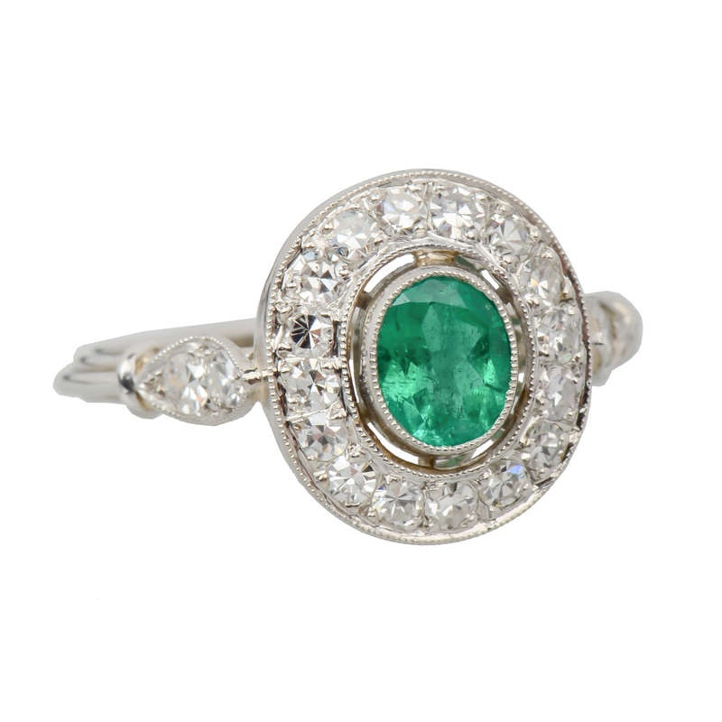 Verdant & lush, this gorgeous emerald contrasts the snowy white diamond and cool platinum.