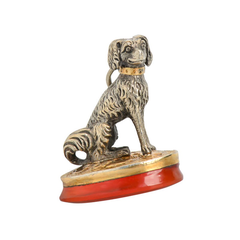 A seated, pert spaniel dog serves as the irresistible motif for this fob and pendant. Of vermeil (yellow gold over silver) and silver, the dog is finely wrought and realistic from every angle.