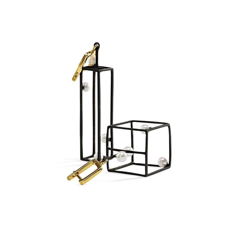Asymmetrical forms of black anthracite have been hand crafted to create a delicate cagelike structure. They dangle with fragile raw grace as white shell pearls glisten from within their metallic prison. A set of Earrings that offer excitement drama and sty