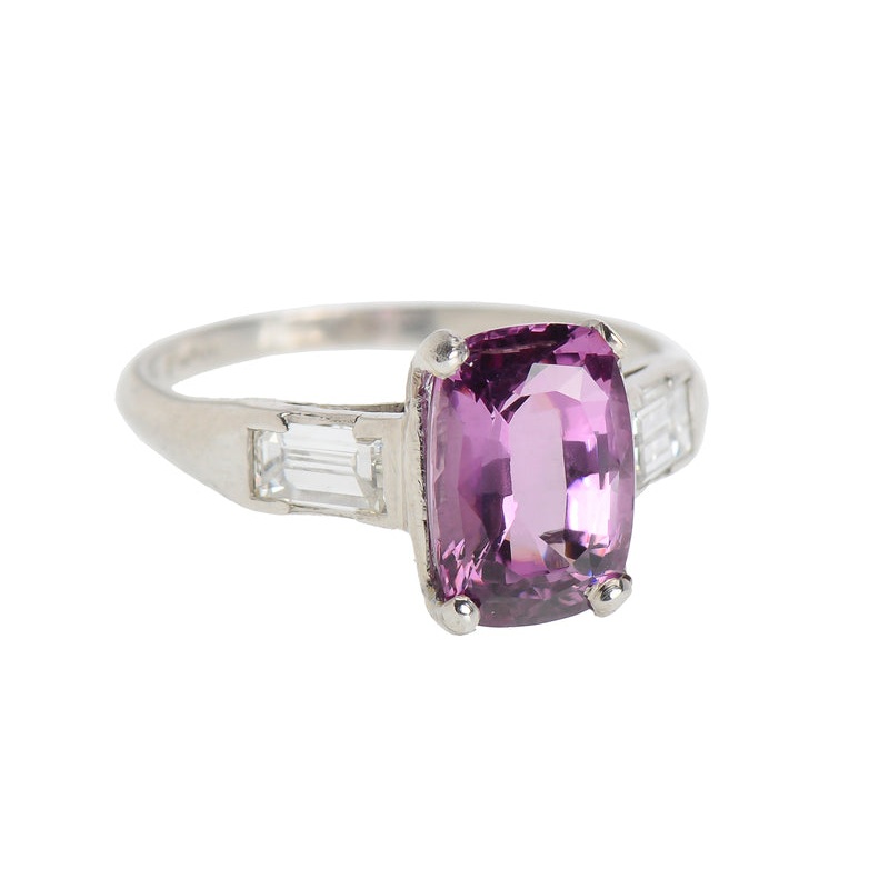 Occurring in almost every color, the spinel featured in this mid-twentieth century platinum ring vibrates with an alluring purple pink tone. The 2.5 carat cushion cut gem shows off its best attributes claw set at the four corners.