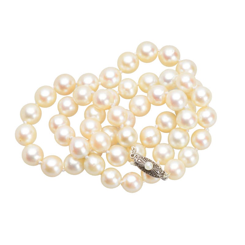At a princess length of over 18 inches, these stylish cultured saltwater Akoya pearls appear as if they have just been lifted from the sea and dripping with life.Radiant and lustrous, and from the famed firm of Mikimoto, their vanilla hues give off a touch