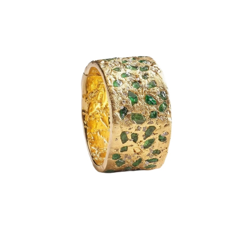 Pale gold sparkles with a textured surface as lines naturally slash across this barrel ring. Sumptuous tsavolite gemstones are placed in a nestled style between each line offering sparkle and texture.Metal: 925 SilverStones: Rough TsavoritePlating: 18K Gol