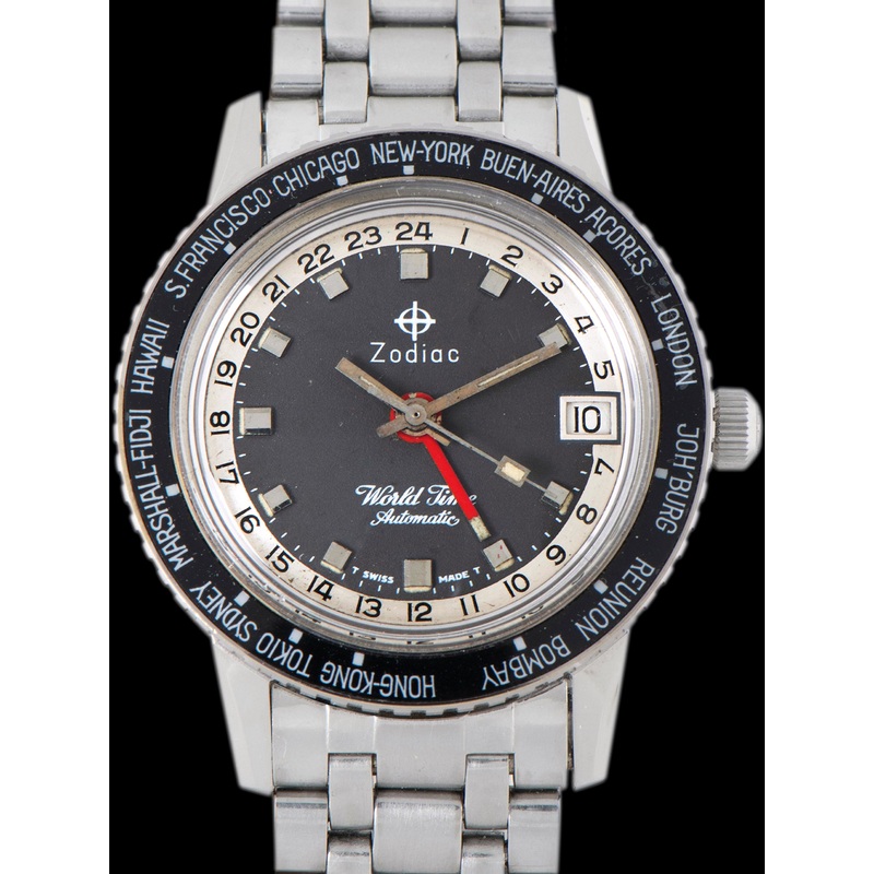 By utilizing the same reference platform as the Aerospace GMT, Zodiac also introduced a World Time. These seemingly much more uncommon variants of the 752-934B feature either a black or red rotating bakelite world time bezel, the same hands as the Aerospace GMT, and a stationary 24-hour scale on the outer dial track. The perfect companion for the world traveler, and this particular example happens to be in stunning condition.