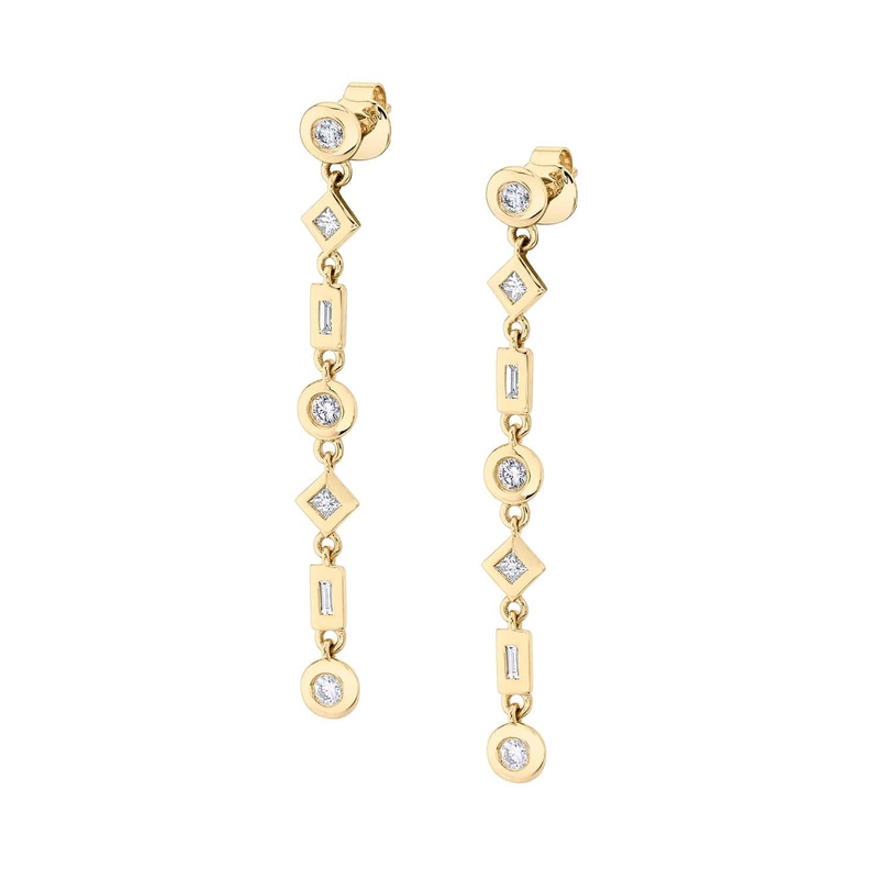 A contemporary graphic point of view on a classic. The Mixed Shape Bezel Tennis Earrings feature a combination of princess, round and baguette stones with the MM take on a bezel – a wider frame of gold surrounding the diamond for a visually impactful style. Everyday luxe for day and night.