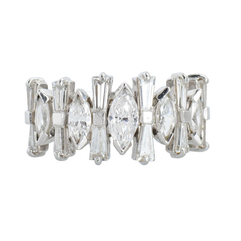 Marquise diamonds alternate with opposing tapered baguettes for a low-profile ring that has an impressive presence. With 2.03 carats of diamonds (H-I color, VS2-SI clarity), it can be worn with an engagement ring, by itself, or stacked with other bands.