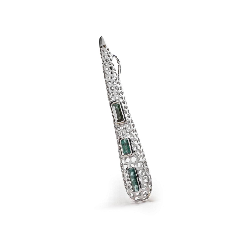 Elongated and sinuous this black rhodium pendant has a grace and fluidity that speaks of nature at work. Lengthening to a rounded design it boasts a series of deep green tourmaline gemstones that enhance the play between color and texture.