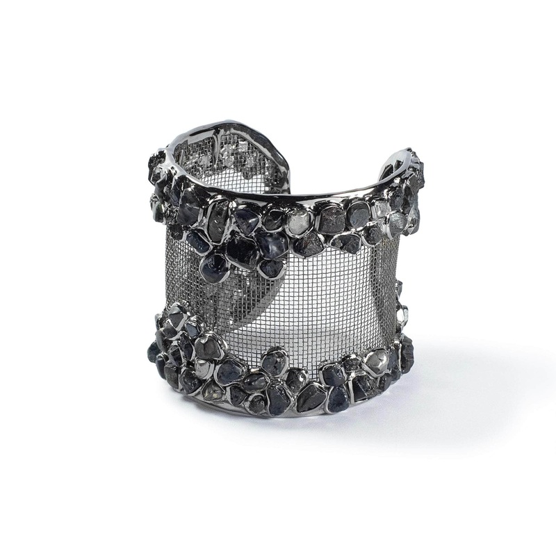 Featuring an unconventional blend of 925 silver and titanium mesh, this singular contemporary bangle showcases natural raw black sapphires, reminiscent of precious barnacles clinging to a boat. Each sapphire is uniquely set, highlighting its raw beauty and