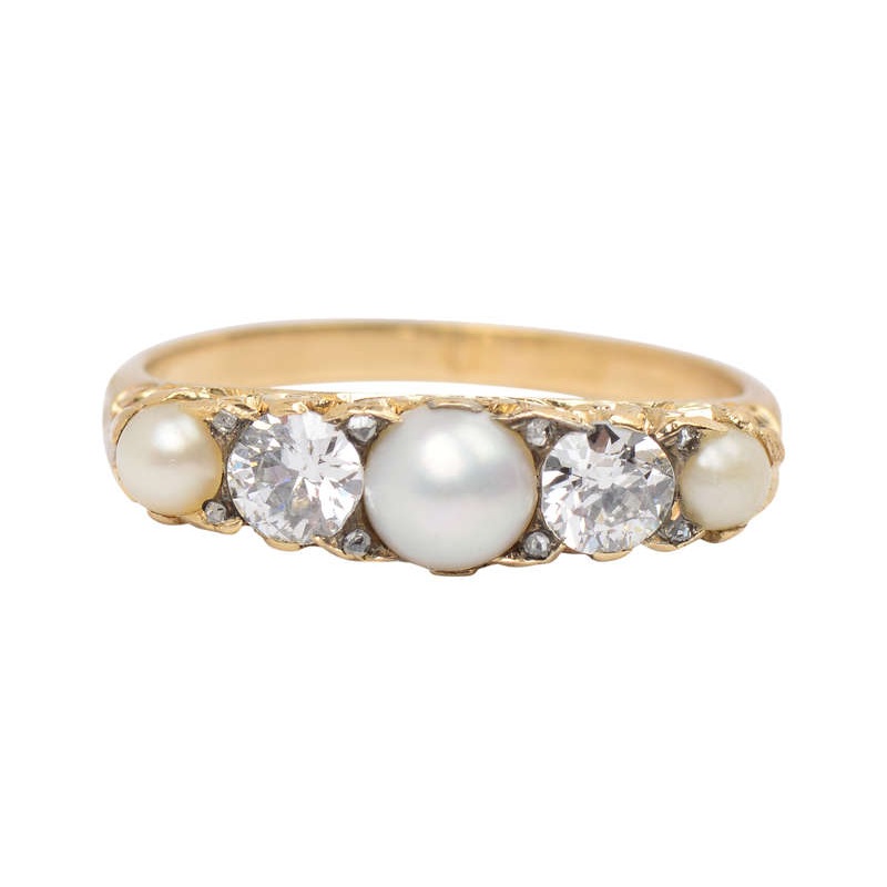 A horizontal line east west alternates with luscious creamy white natural saltwater pearls and refractive old European cut diamonds in 18k gold.