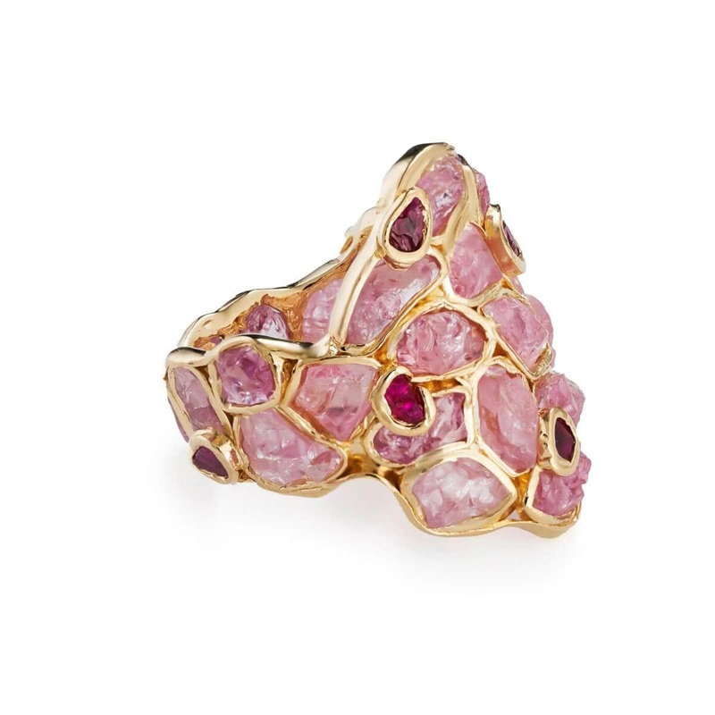 This wider barrel style ring is richly coated with beautiful glowing gemstones that have true grace. The bright gold setting allows them to shine brightly and brilliantly with their rich color and to celebrate their raw organic shape.