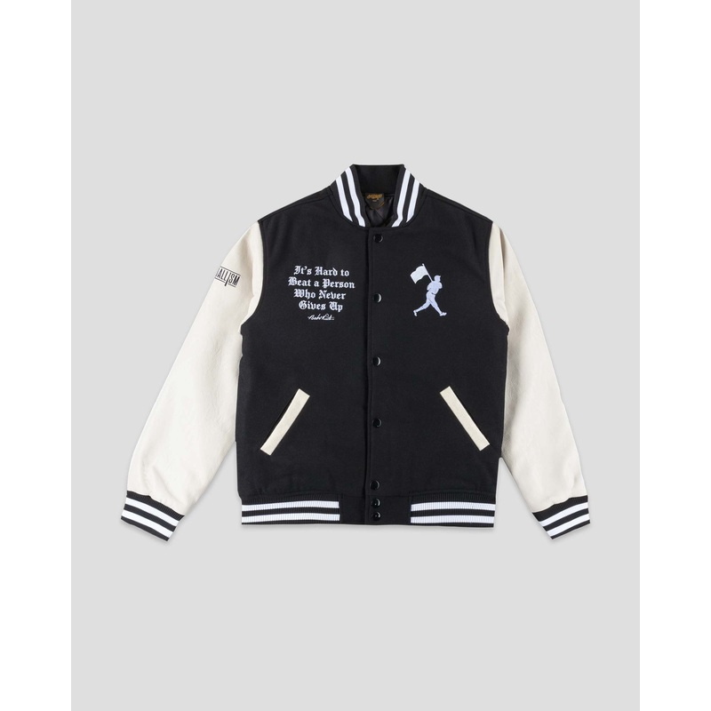 The Never Give Up Varsity Jacket combines classic varsity style with modern craftsmanship and meaningful details, creating a piece that exudes confidence and resilience.