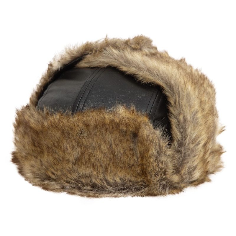 New Era Image Leather Trapper HatNew Era flag on leftUnstructured crownFaux fur trapper flap at frontFaux fur ear flaps adjustable with buttonFaux fur dogear flaps adjustable with press studs to wear up or downMade from genuine leatherFaux fur lining100% G