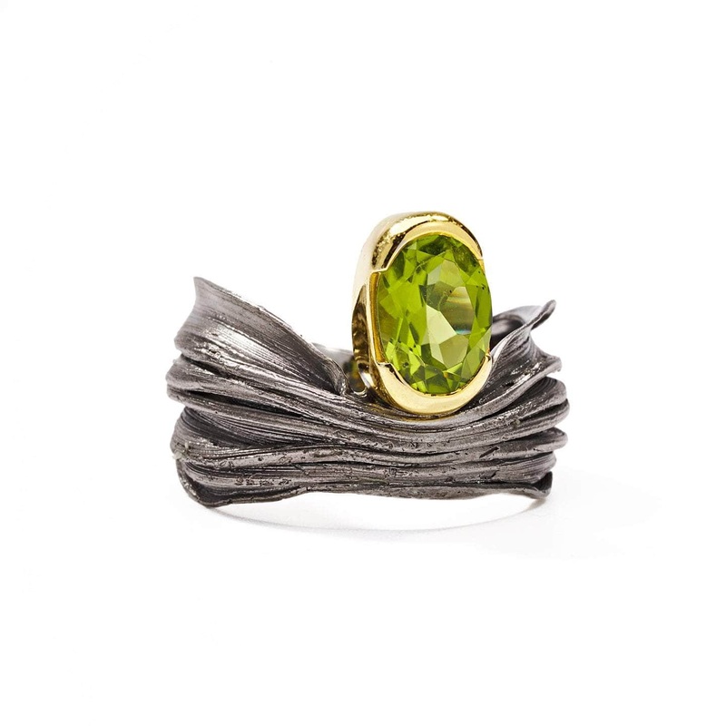 A captivating peridot clings to the edge of a black rhodium ring. This piece is pleated with rippling folds of precious metal that undulate in an infinite loop of curving movement. Texture meets color in a marriage of natural expression.Metal: 925 SilverSt