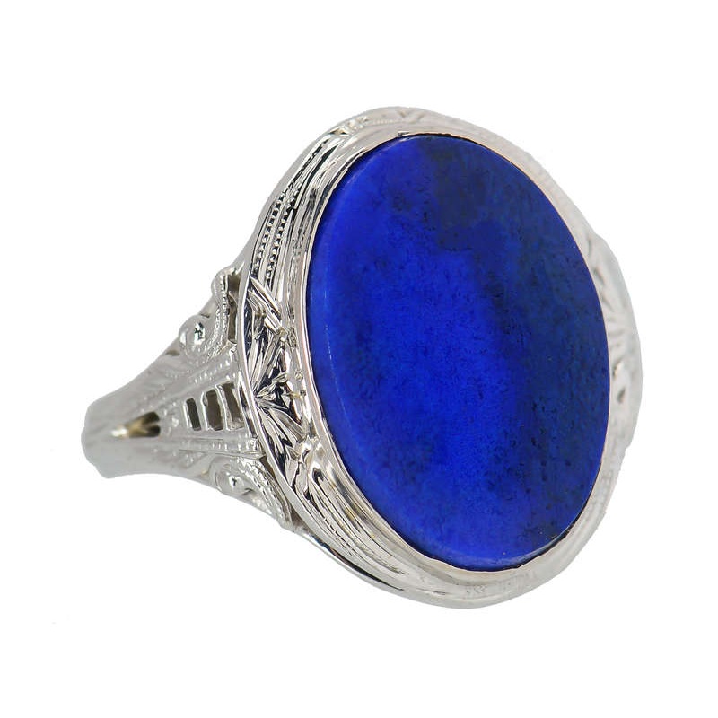 The 16 mm by 10 mm lapis cabochon is bezel set and adorned with filigree shoulders. In 18k white gold, beneath the bezel are patterns on the perimeter of the lapis. The shoulders utilize scrolls and open work in contrast to the smooth gem.