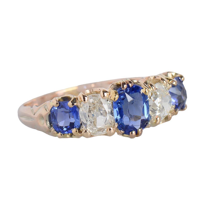 Three captivating sapphires embrace the finger with a compliment of two all-out dynamite old mine cut diamonds.
