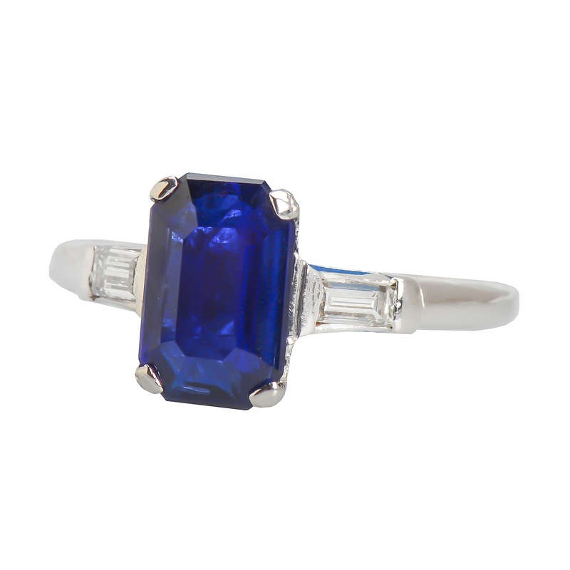 A 2.15 carat emerald cut royal blue sapphire has an air of mystery about it. One of the intrigues of gemstones is that no two are alike, and this mid-century ring sparks that special something.