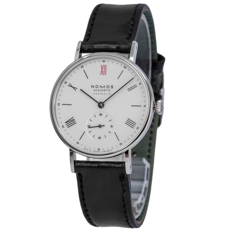 TECHNICAL DATABrand: NomosFamily: LudwigReference: 282.S2Name: NOMOS 282.S2 Ludwig Neomatik Fr rzte Ohne Grenzen Ltd.Ed.CASEMaterial: SteelGlass: Sapphire GlassDiameter: 36,4 X 0Case Thickness: 7Water Resistance: 5 ATMDIALColor: WhiteDial Markers: Roman numeralsBezel: Stainless SteelMOVEMENTType: AutomaticCalieber: DUW 3001Base Caliber: -Jewels: 27Reserve: 43 hoursBANDMaterial: LeatherColor: BlackWidth: 18Clasp: BuckleFUNCTIONSSmall Second,OTHER FUNCTIONSDisplay back,Limited Edition ,