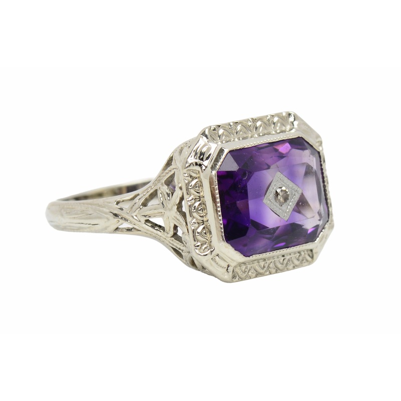 This ring of 18k white gold filigree, features a faceted natural amethyst. Set east and west, it radiates with a royal purple hue. At the center, is a tiny diamond in white gold.