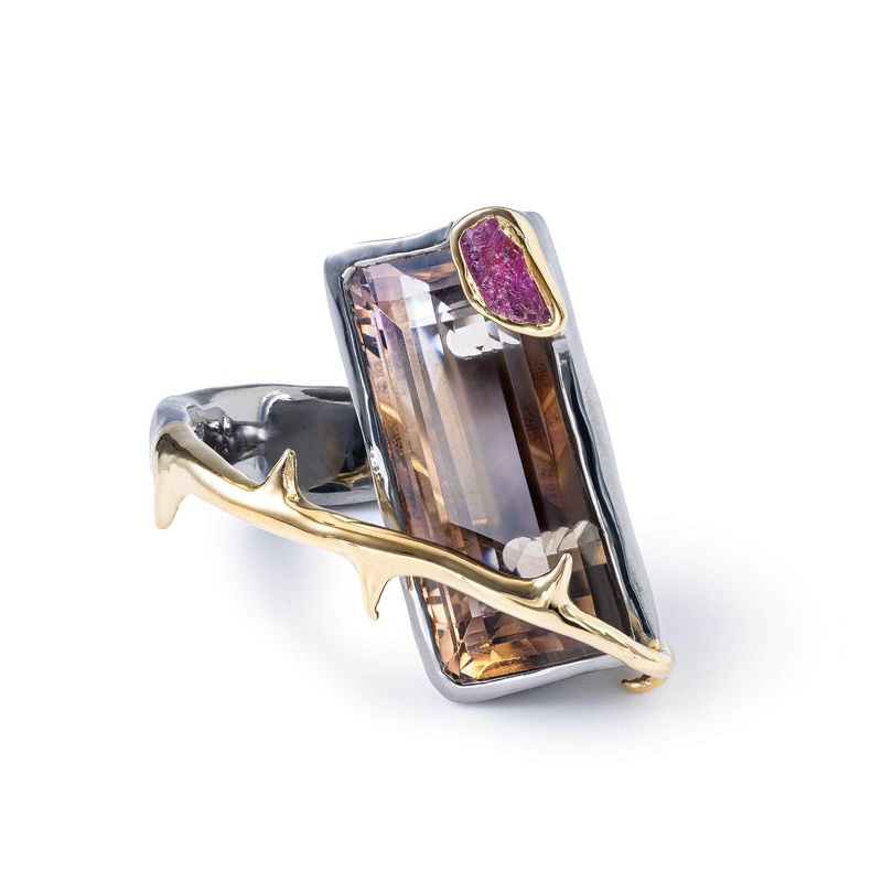 A one-of-a-kind designer ring, crafted as wearable art in 925 sterling silver with Black Rhodium and Gold plating. Holding an impressive octagon-cut bicolor Ametrinea natural wonder blending two colors in a single crystalshaded by an untouched raw Ruby in the corner, just as it was found in nature. The design echoes a wild, dangerous plant, yet it doesnt intimidate its wearerit protects, bonds, and becomes part of you.