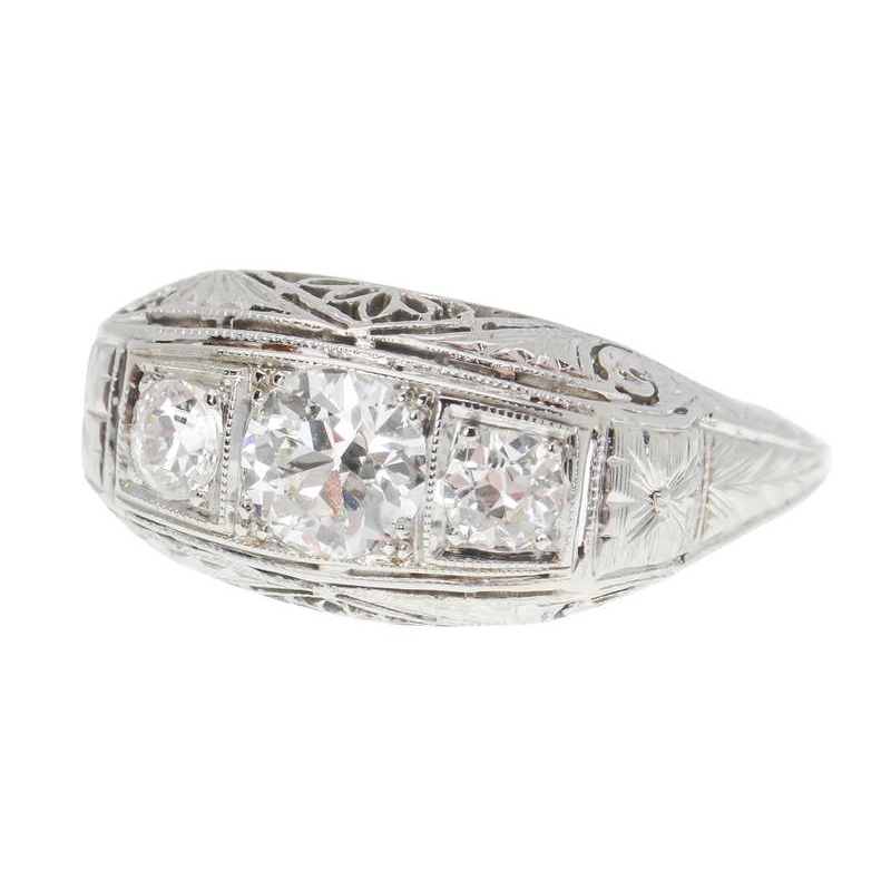 A trifecta of brilliantly vivacious old European cut diamonds weighs a total of .77 carats, covering the finger in glitter and glamour.Placed as a linear and horizontal threesome, each is displayed in a square surround. The lacy nature of the 18k white gol
