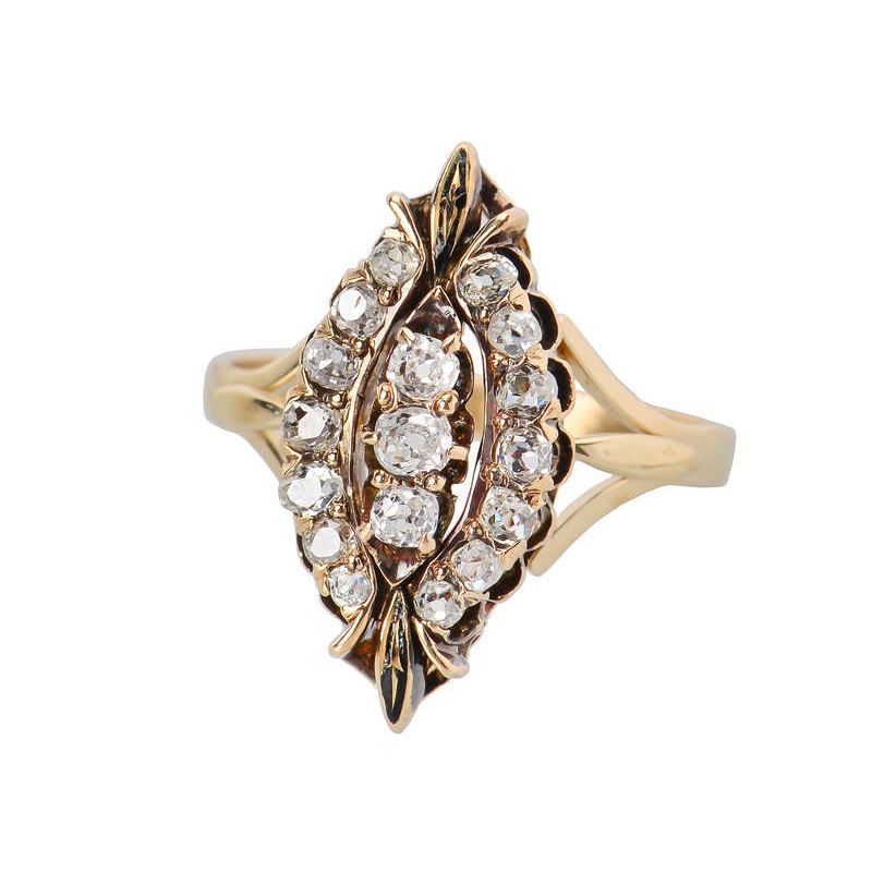 Seventeen of these antique diamonds line the edges and form a short stripe down the middle of the 14k yellow gold marquise shaped ring.
