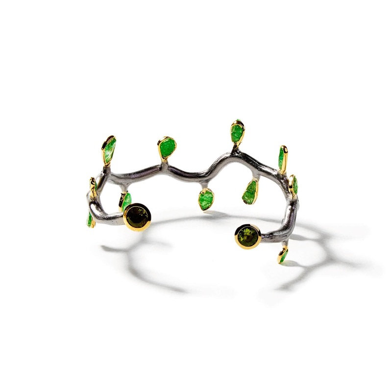 An astonishing silver bracelet sprouting raw tsavorite crystal leaves that have miraculously grown into a quirky piece of jewelry. It’s as if the forces of nature decided to play fashion designer and gave birth to this whimsical masterpiece in the heart of the enchanted forest. Embrace the ode to all natural wonders and celebrate the resilience of living creatures as you become the privileged owner of this exclusive treasure with no rival in the entire plant kingdom.