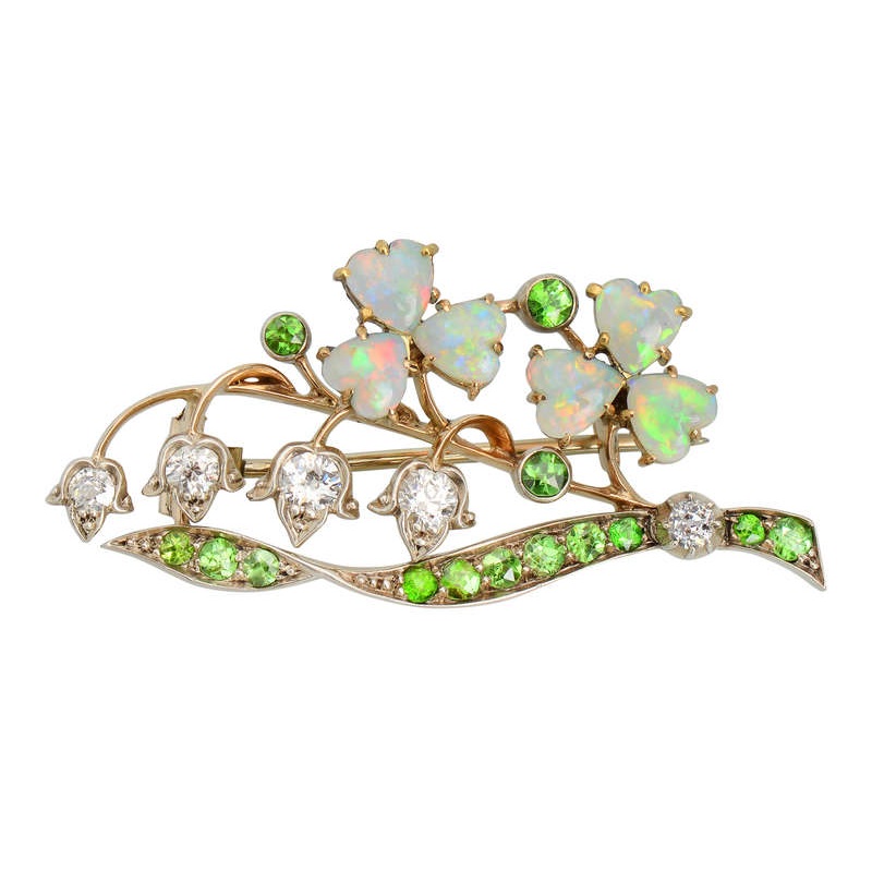Two emblematic types of flora are represented in this exquisite antique brooch.Both the lucky clover and lilies of the valley representing joy and happiness merge with an interplay of motifs and color.Two three leaf clovers are formed by hand carved Austra